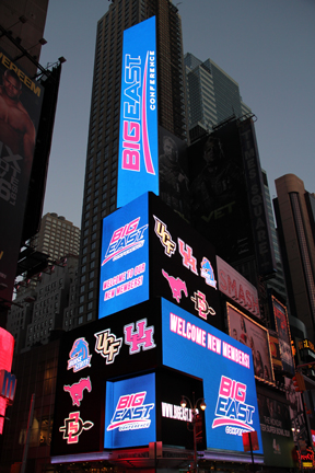 The Big East maintains ad space on the American Eagle Outfitters store in Times Square. American Eagle Outfitters is the presenting sponsor for the Big East Tournament and other official Big East entities. Earlier we posted an image of the Boise State advertisement. It turns out, the Big East actually ran similar displays for all five of the new members (SMU, UCF, Houston, Boise State, and San Diego State) as well as an ad for all five of them together.