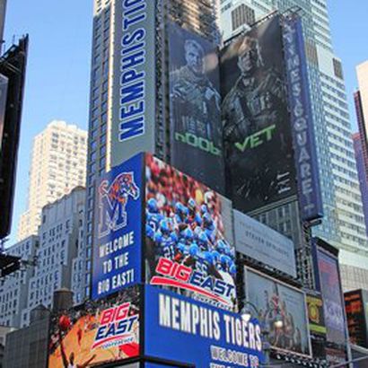 The Big East welcomes Memphis to the conference with this full display ad on the American Eagle Outfitters in Times Square in New York. The conference previously ran the same style welcome ads for Boise State, Houston, SMU, San Diego State, Navy, and Central Florida. You can view those here.